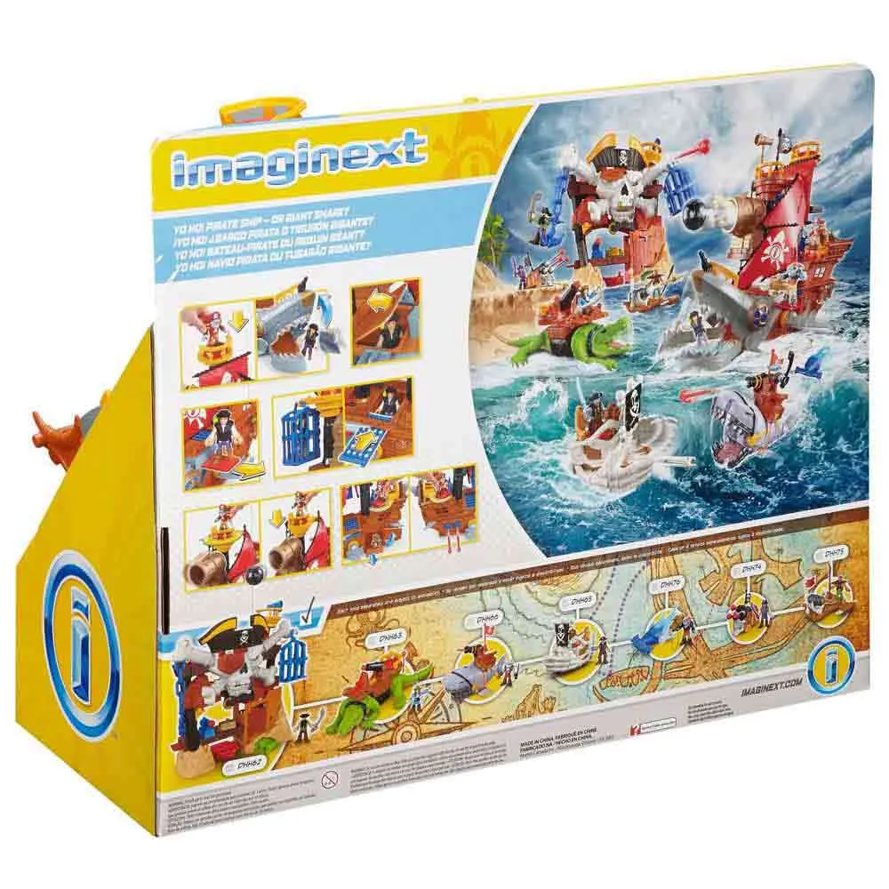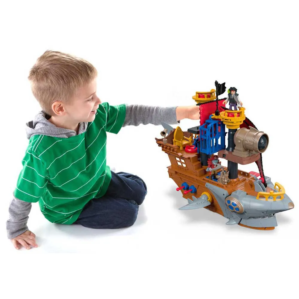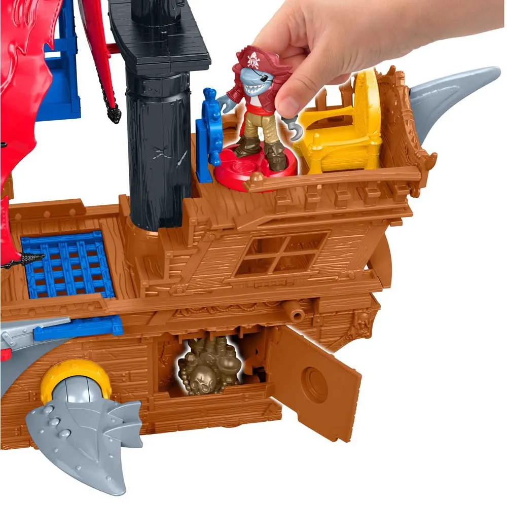 To protect your treasure from Blackbeard and his raiders, push on a Power Pad to capture attackers in one BIG shark bite! Still more coming? Turn another Power Pad to aim the cannon and fire – or push button on launcher to send projectiles flying! Now it´s all hands on deck for more high-seas adventures! Young buccaneers can throw prisoners in the brig that opens & closes … have them walk the plank … or hang ‘em from the yardarm.