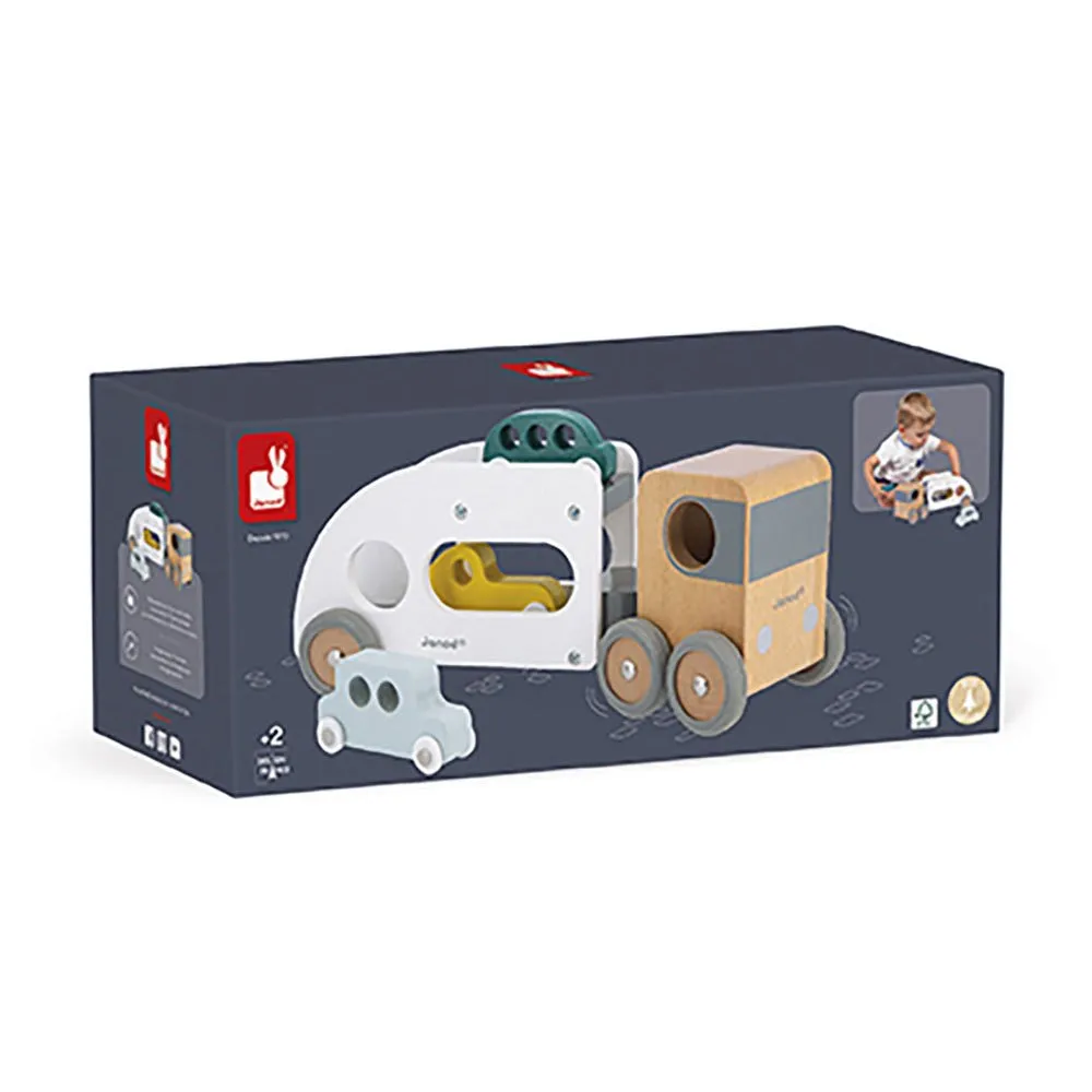 Special delivery!! This big wooden car transporter truck, with detachable trailer, can deliver 3 cars at a time.