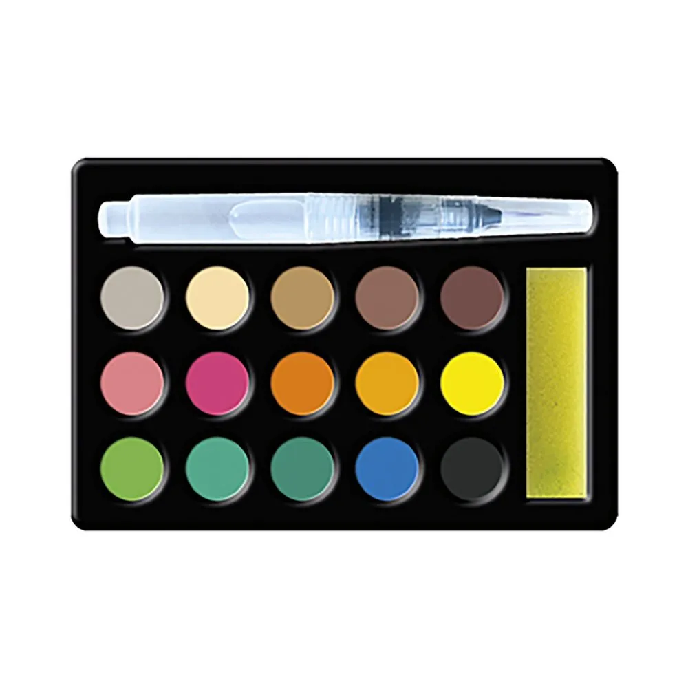 A palette of 15 watercolour paints, a sponge and a brush with water reservoir make this set an original activity.
