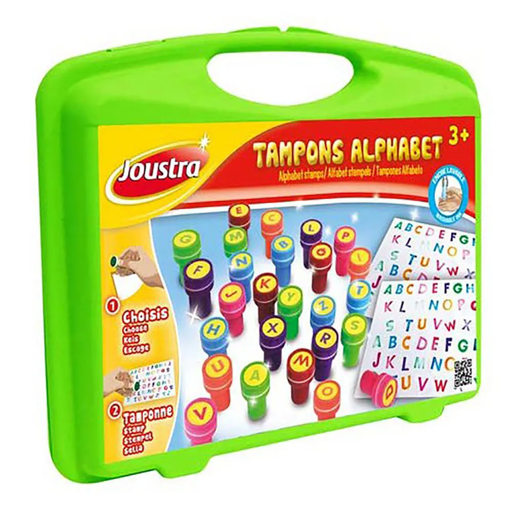 26 self-inking stamps in different colours on the theme of the alphabet, fun and educational
