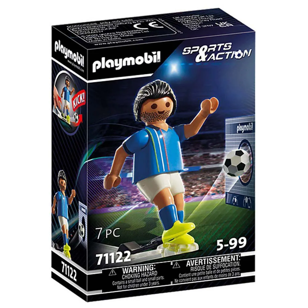 The PLAYMOBIL soccer stars are ready for the big tournament. The national player from Italy gives everything for his team. Which team will win? With the practical one-hand kick function, both flat and high balls can be placed precisely. Includes cardboard goal wall. Combine with the soccer stadium (71120) for even more soccer fun. With the enclosed blank labels, the figure can be individually labeled with the name and serial number of the favorite player.