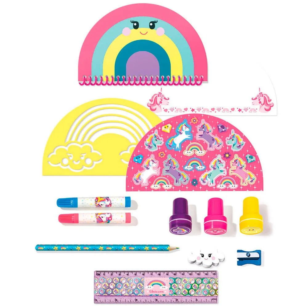 Unicorn briefcase with more than 50 pieces to make stationery crafts, stamps, markers, drawings, pencil, rubber, rules, etc.